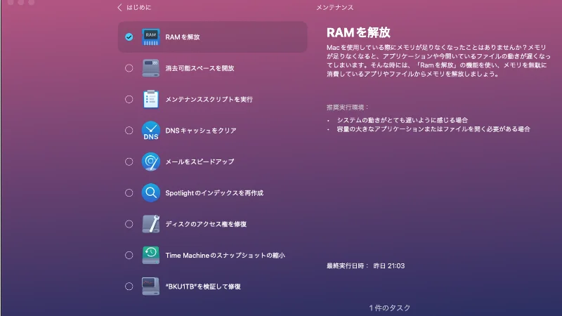 それでもメモリの消費量が気になるときは、メンテナンスアプリでメモリを解放する。